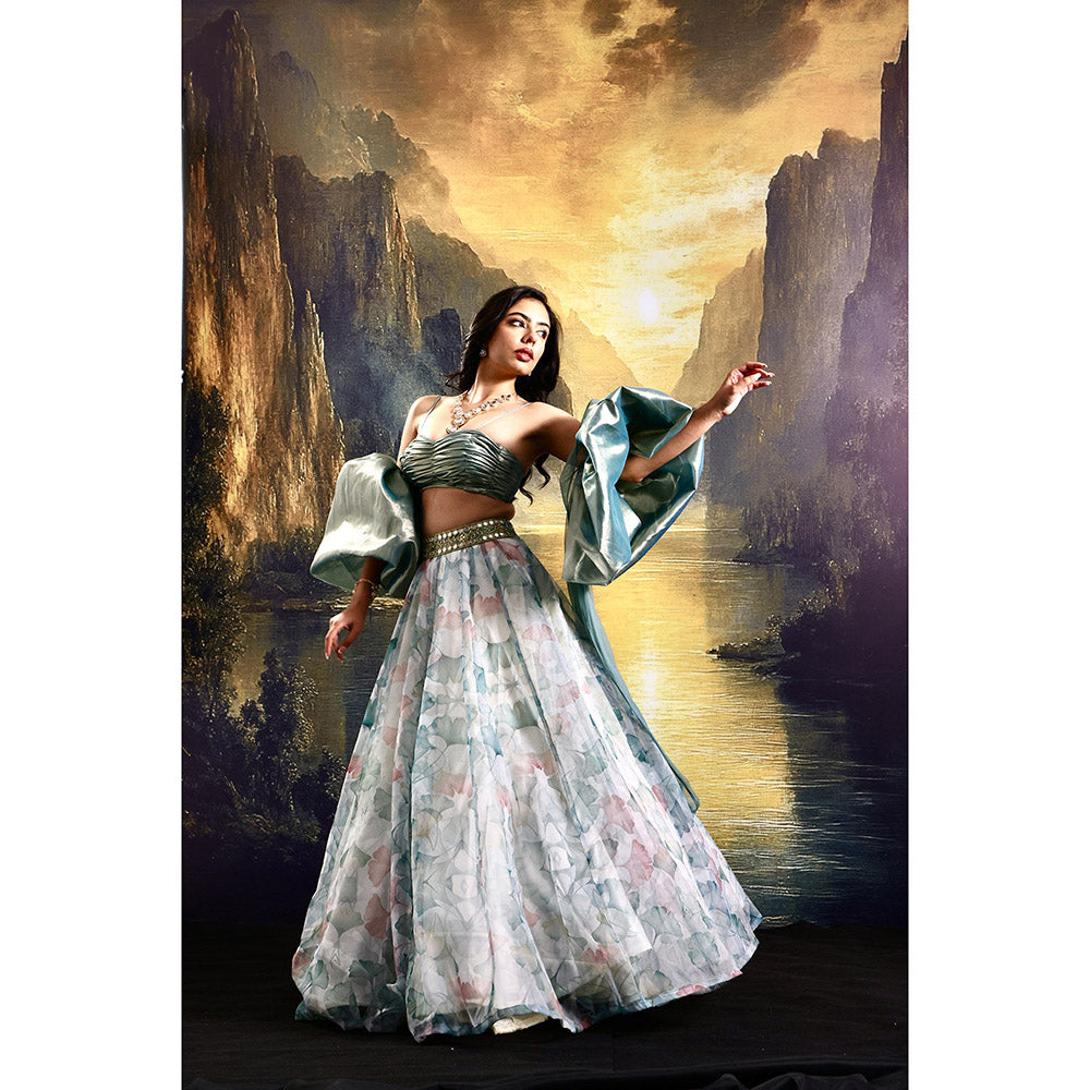 Description : Printed Organza Lehenga with Our Signature Pleated Tissue Blouse. Paired with Our Statement Tissue Cuff Dupatta with Net