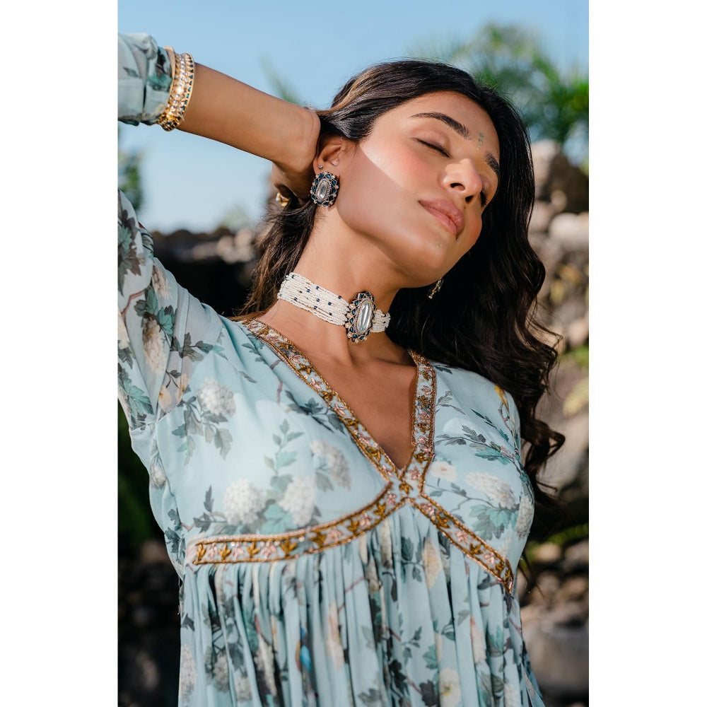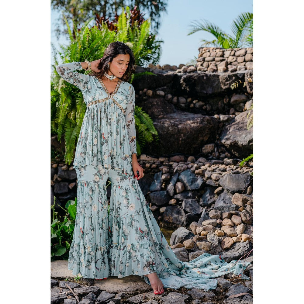 Redpine Designs Powder Blue Printed, Embroidered Sharara with Kurta and Dupatta (Set of 3)