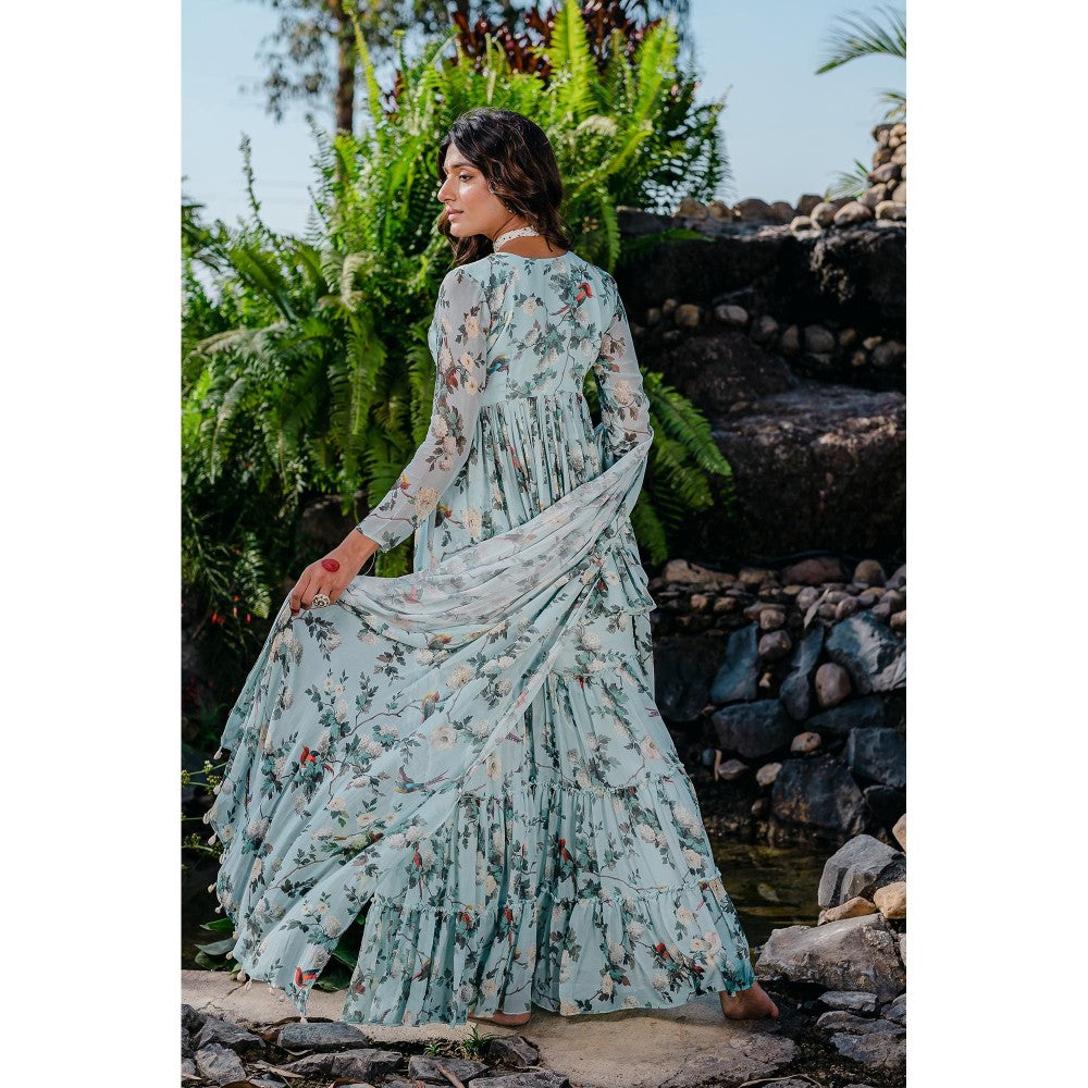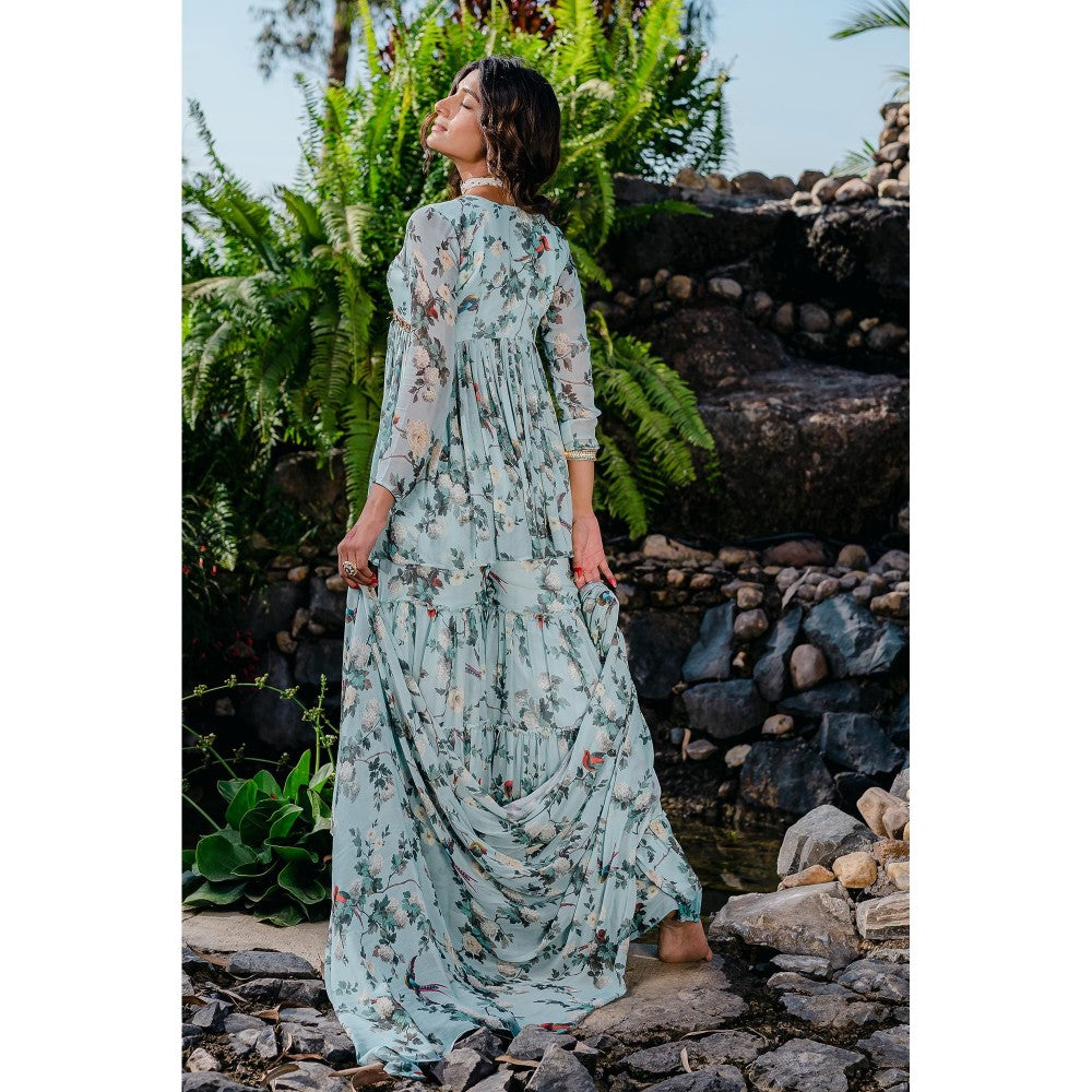 Description : Featuring A Powder Blue Printed Sharara In Georgette Base With Saadi, Kasab, Shell, And Sequin Hand Embroidery. It Is Paired With Printed Georgette Flared Sharara Pants And Dupatta With Shells.