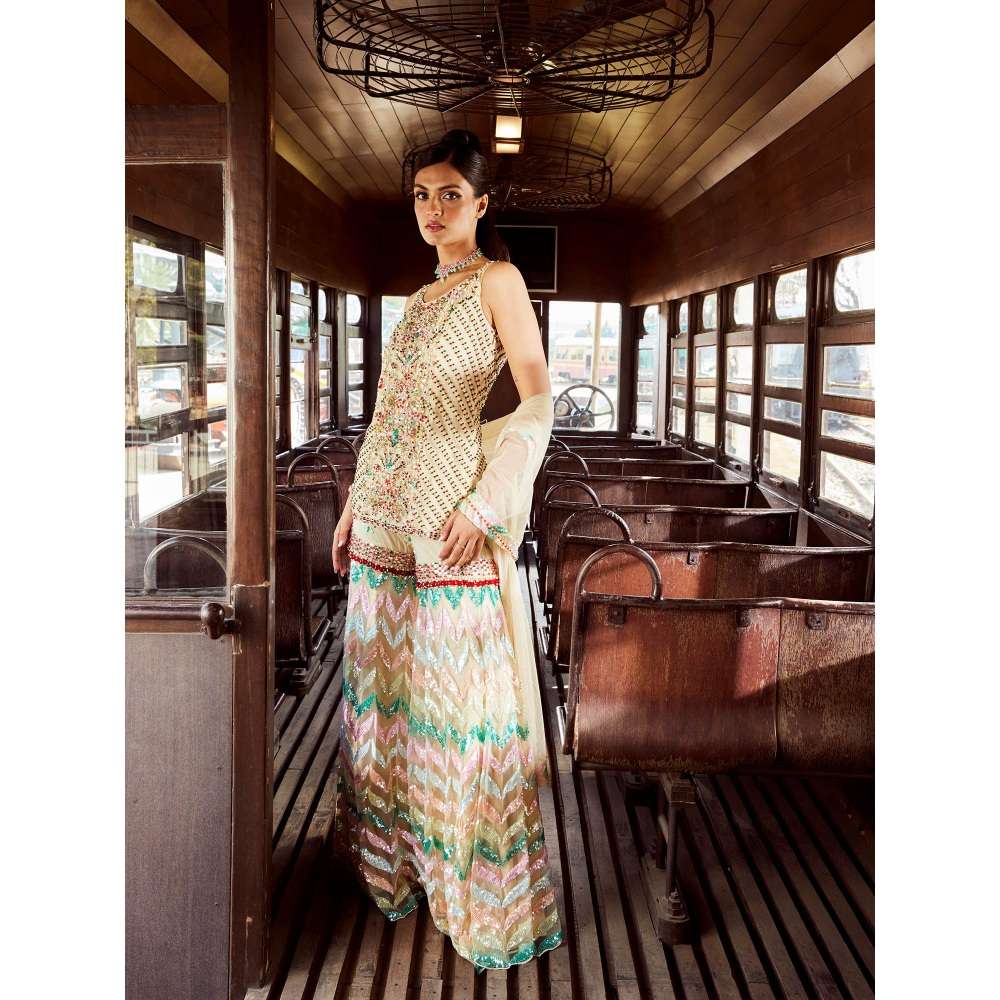 Rococo Caprice Beige Top with Sharara and Dupatta (Set of 3)