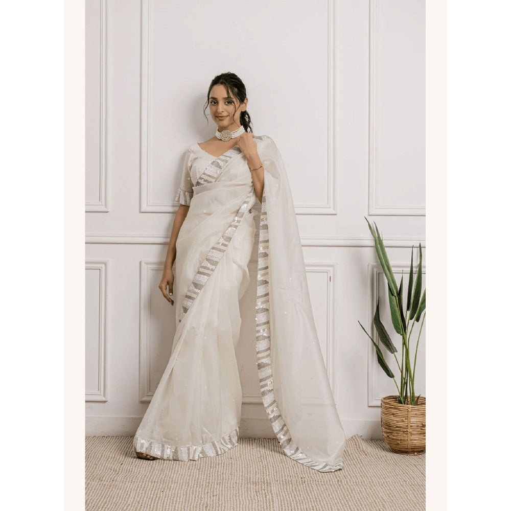 White Floral Aura Organza Saree with Stitched Blouse