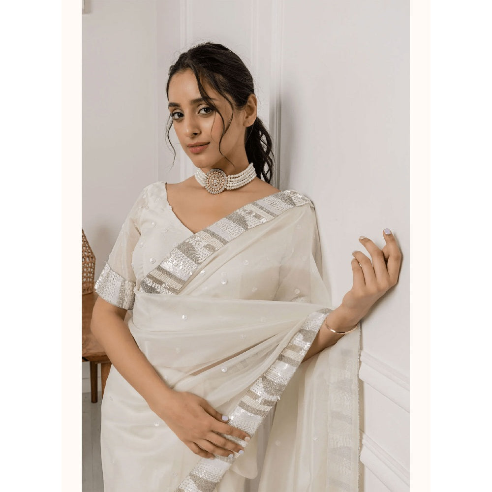 Ruhm White Floral Aura Organza Saree with Stitched Blouse