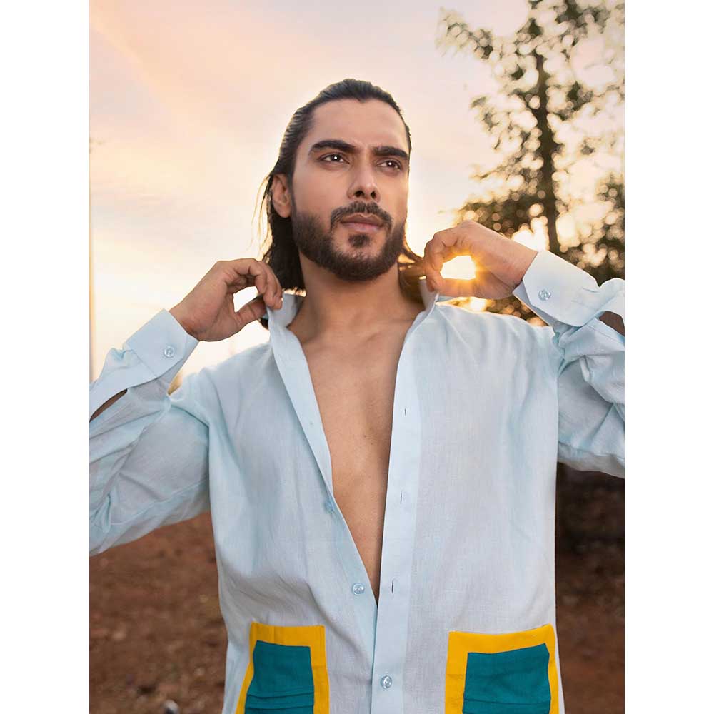 Description : The shirt is hand-dyed and color blocked with patch pockets, inspired from a summer eve hues.