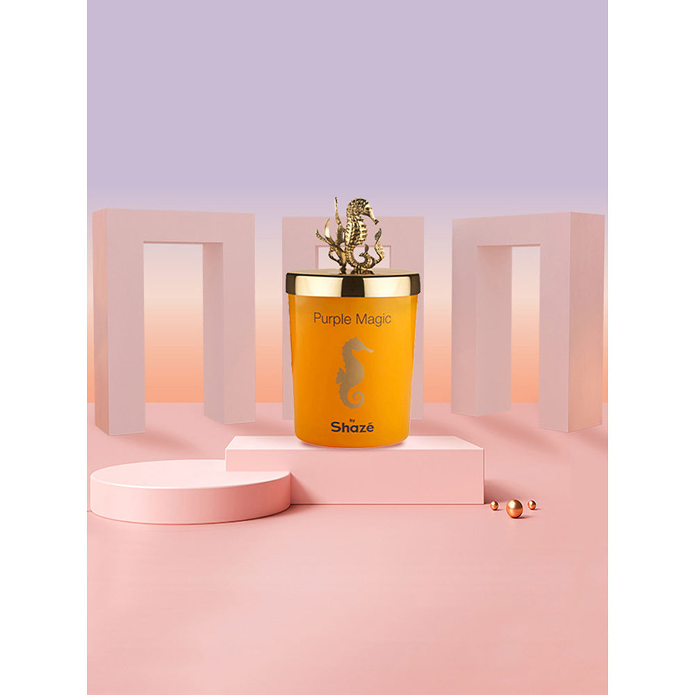 Description : Set in Shaz orange jars, with designed lids bearing intricate motifs, our candles are a delight for the senses. Creating a depth of sweet fruity fragrance with its zest-meets-floral notes is Purple Magic.