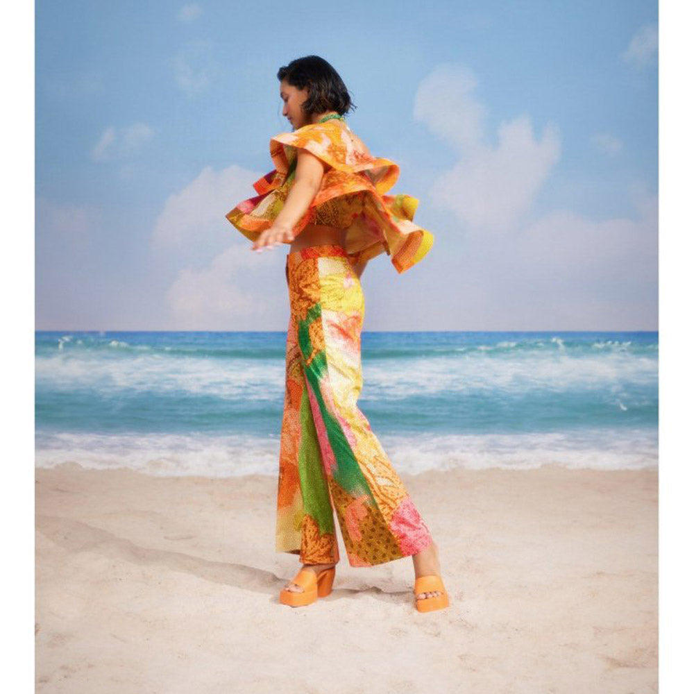 Description : Asymmetric One Shoulder Ruffle Top with Printed Trouser Co-Ord Set