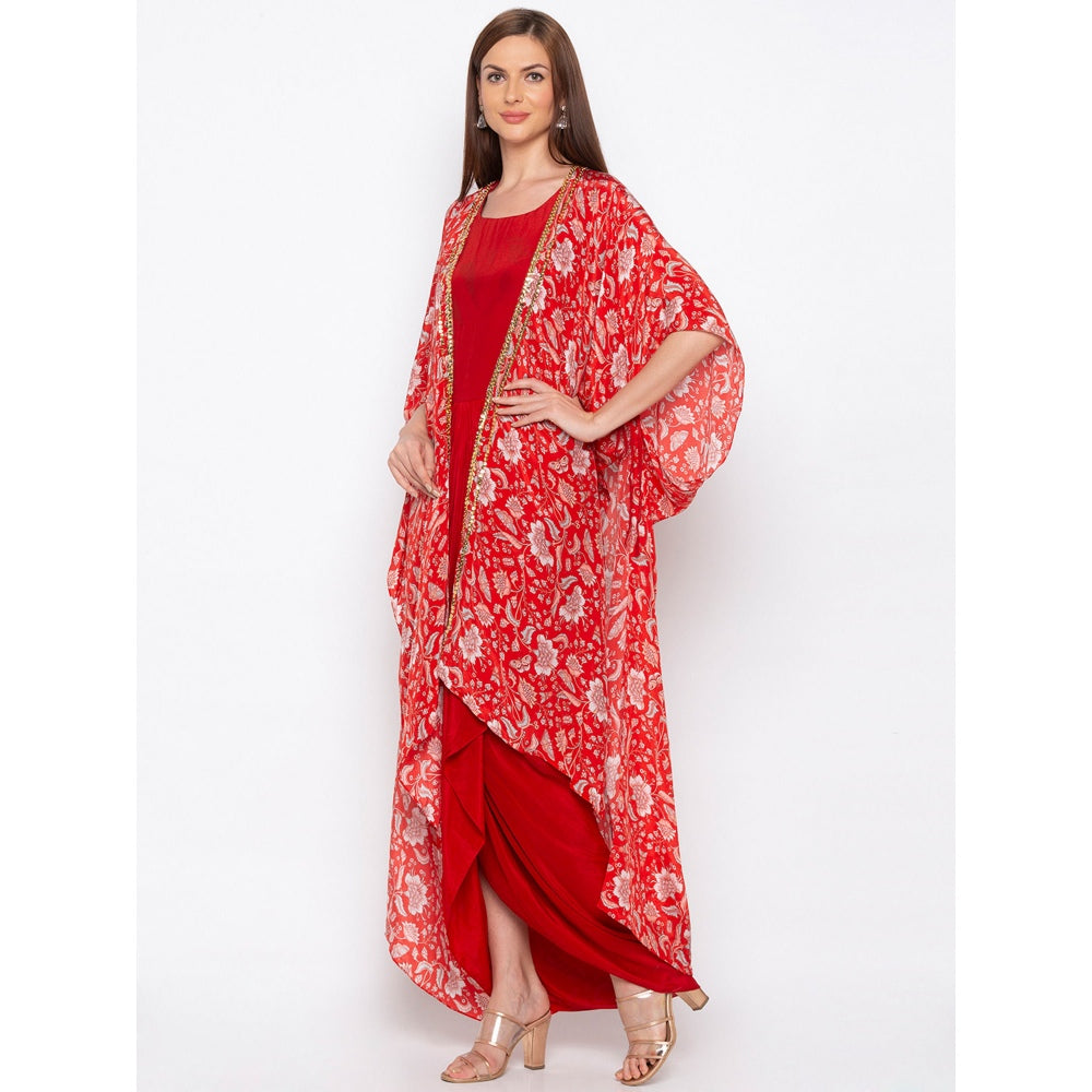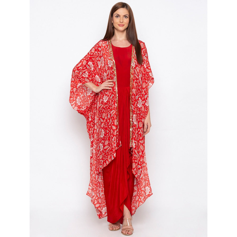 Description : Red Solid Drape Dress With Printed Cape Enhanced With Gold Embroidery