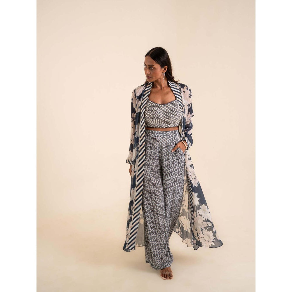 Description : An Indigo Blue Floral Print Jacket Set with Geometric Print Hand-Embroidered Bustier, Paired with Geometric Print Pants.