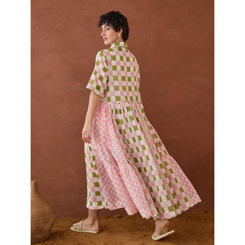 Description : Flowy and refreshing, this shirt dress is crafted from the softest cotton mul mul, hand-blocked in a grid of playful pink and green-echoing the vibrant energy of spring. The Spring Mosaic dress features a relaxed button-down silhouette with a shirt collar. Designed for movement, the gentle flare of the hem and thoughtfully placed gathers bring grace to every step. This dress is perfect for sun-drenched strolls or cozy cafe mornings. This effortless piece blends nostalgic charm with modern comfort-ideal for the free-spirited heart.