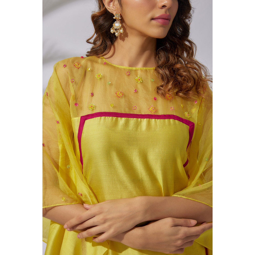 Description : Featuring pure chanderi base yellow kaftan with sheer organza panels, embroidered with sequins and glass beads. Tailored to sartorial perfection from premium quality fabric, it assures a soft and soothing touch against the skin. The exquisite silhouette adds to its appeal.