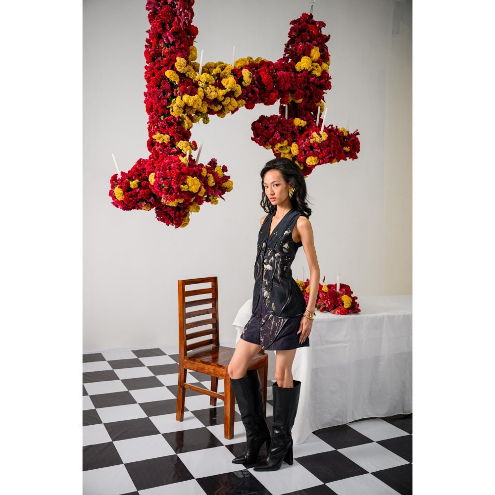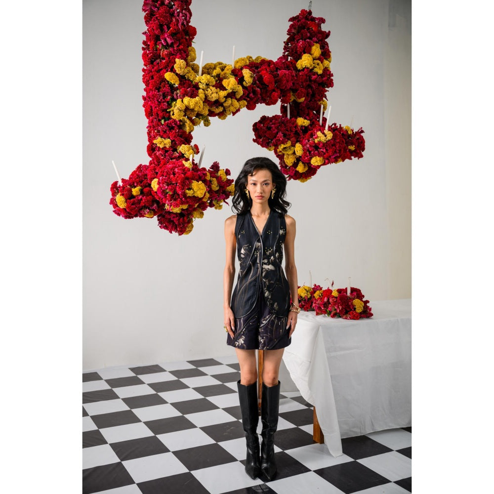 Description : Turn up the drama with the Gilded Midnight Waistcoat, where vintage meets vanguard. Crafted in premium black Chanderi, this waistcoat flaunts a floral vintage print with in cut shoulders that bring a sharp edge. The abstract wavy leather binding glides across the front and hems, while miniature golden studs add just the right touch of midnight glamour. Pair it with matching vintage floral print shorts, detailed with studded leather bindings in an abstract wave pattern, for a look that s pure statement-making sophistication.
