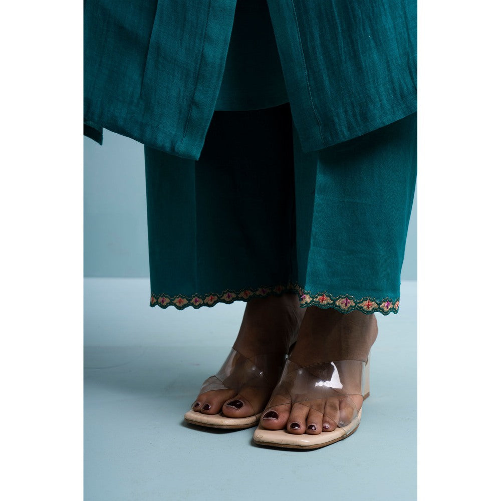 Description : Teal Blue Front Open Kurta, Adorned with Delicate Thread-Embroidered Florals Inspired By Japanese Oriental Artistry. The Design Features Voluminous Sleeves with Intricate Pleated Details and Embroidered Edges. Paired with A Matching Cotton Palazzo with An Embroidered Hemline, This Set Seamlessly Blends Cultural Inspiration with Contemporary Style. The Ensemble Includes A Soft Mul Cotton Inner.