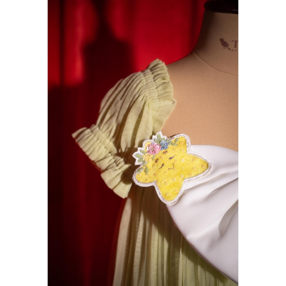 Description : This Adorable Olive Green Tulle Dress Is Sprinkled with Dainty White Flowers and Finished with A Statement White Bow Adorned By Smiling Star Patches. with Ruched Sleeves and A Dreamy Flowy Silhouette, It's A Whimsical Pick For Little Fashion Stars.