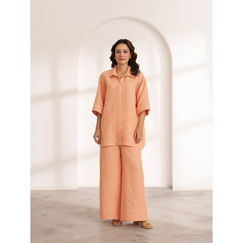 Description : The Lavasa Linen Set Is The Perfect Balance Of Ease and Elegance. Crafted In Pure Linen, The Relaxed Shirt and Wide-Leg Pants Offer Effortless Comfort While Keeping It Chic. The Beautiful Peach Hue Mirrors The Soft Glow Of The Sun Reflecting Over Lavasaa S Lakes, Evoking Warmth, Leisure, and Slow, Sun-Drenched Days. Breezy, Versatile, and Timeless Just The Kind Of Set Youa Ll Reach For, Whether Youa Re Strolling By The Waterfront or Embracing A Laid-Back Day In The City.The Length Of This Shirt Is 29". Since This Is A Loose Shirt, One Size Can Fit Upto 2 Sizes Comfortably. Pallavi Is Wearing A Ready 44" Bust Size Of The Shirt for That Loose Fit (Size: Small To Medium). The Shirt Is A Loose Fit, Drop Shoulder Shirt; It Is Not Lined. The Pants Are Length 38", Fully Lined.