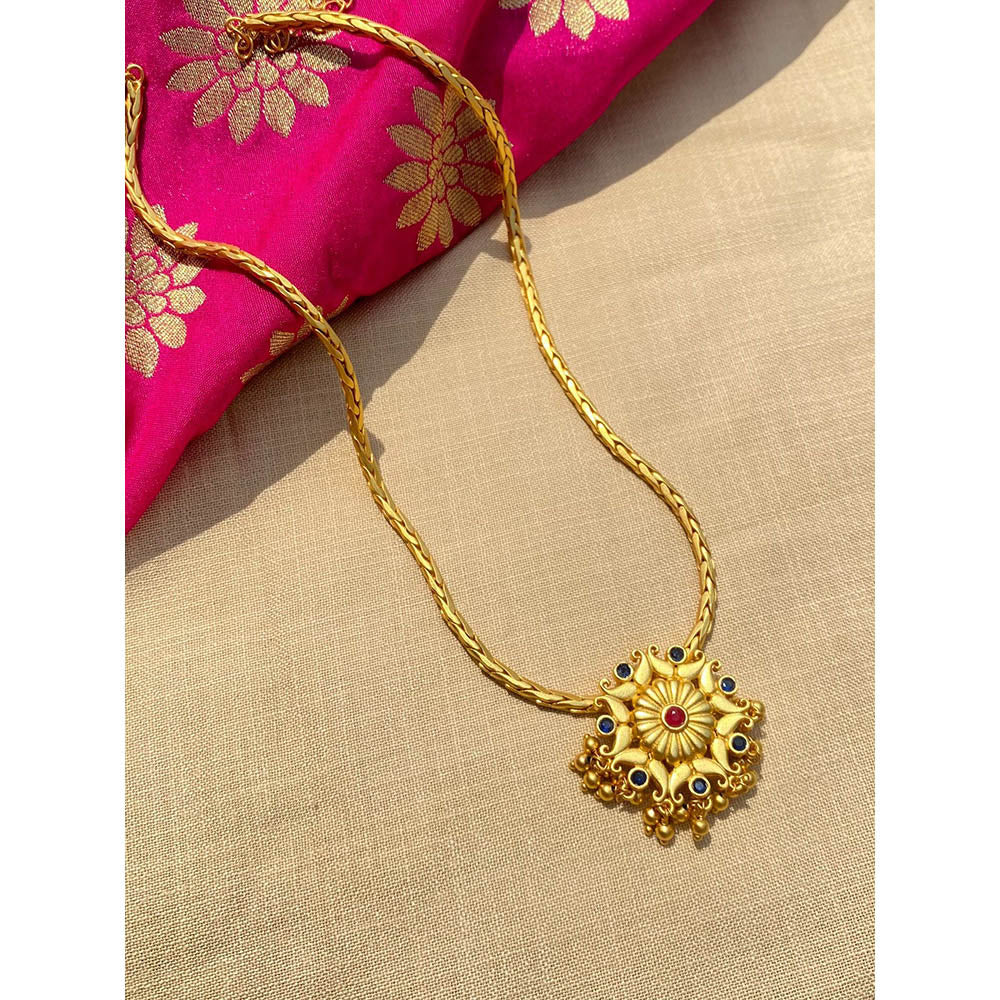 Description : Delicate, graceful and endlessly versatile. This 22kt gold plated pendant necklace features an intricately crafted floral motif. It is a timeless symbol of beauty and femininity. Wear it solo for a hint of understated charm or layer it up with more to add depth and detail to your jewellery look. Finish the look with matching earrings from the collection for a more coordinated and put together look. The pendant is studded with Blue and Ruby Red cubic zircons.