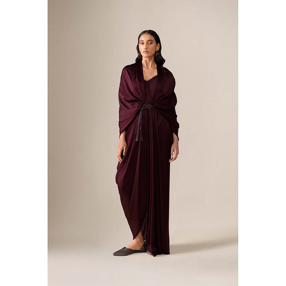 Ekiya Burgundy Pre-Draped Saree With Attached Stitched Blouse And Belt