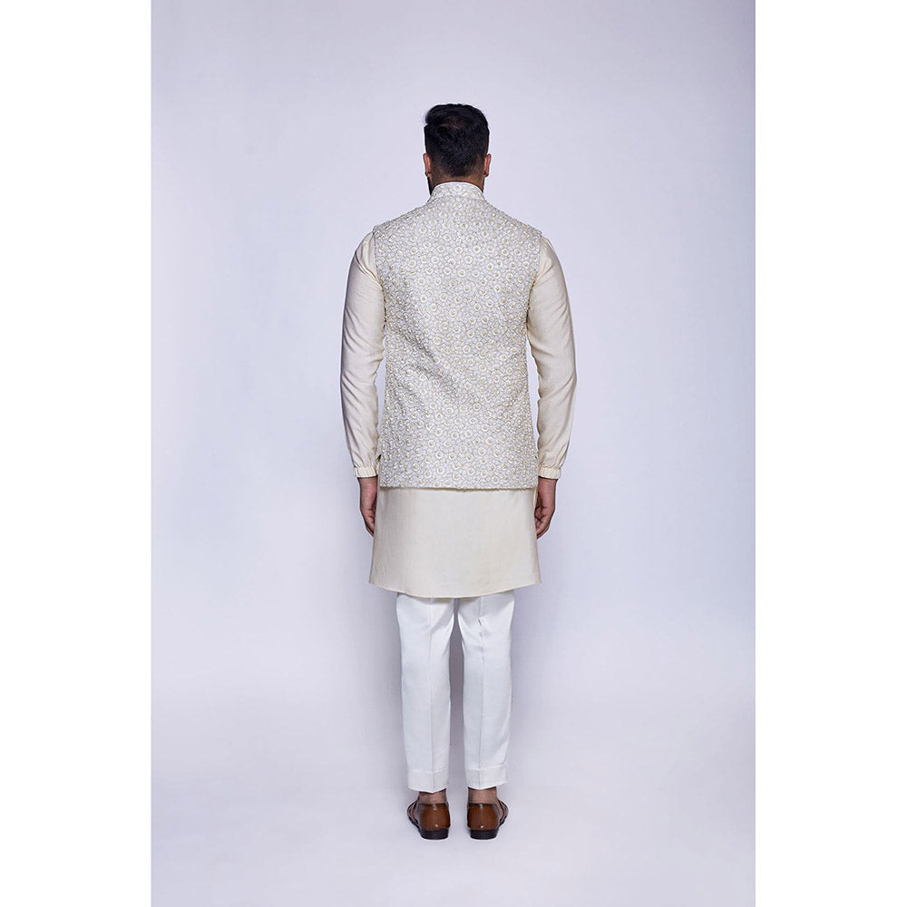 Description : Champagne Resham And Cut Dana Embroidered Arc Cut Bundi Set. Tailored to sartorial perfection from premium quality fabric, it assures a soft and soothing touch against the skin. The exquisite silhouette adds to its appeal.
