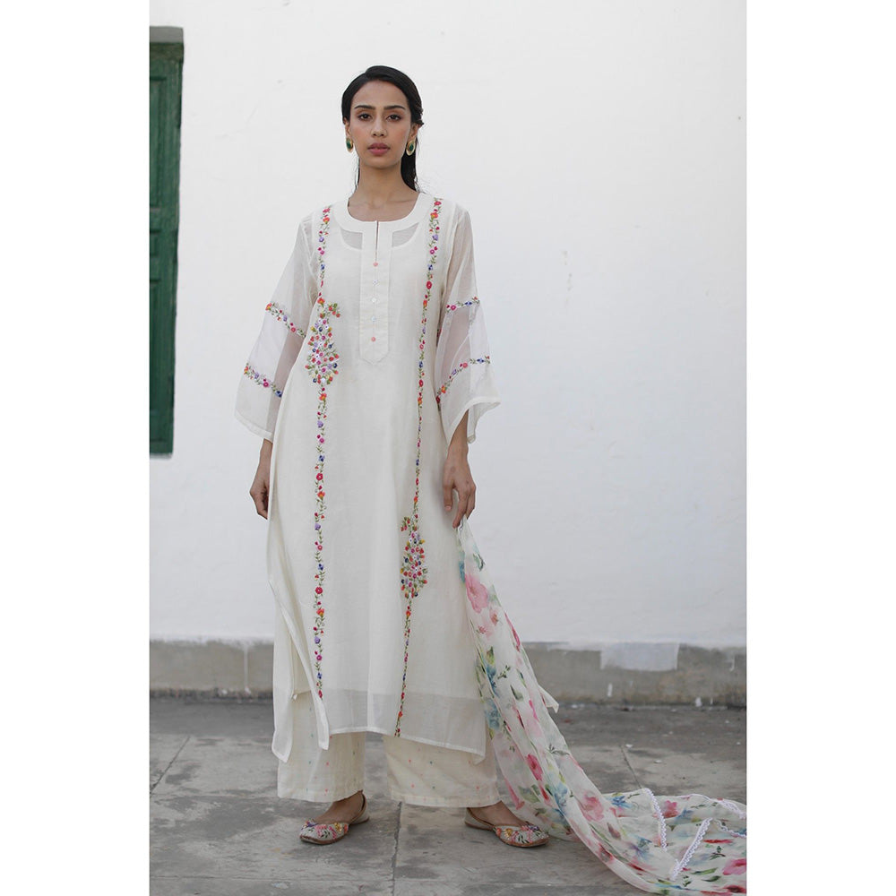 Description : This chanderi kurta set from Begum Pret comes with all over hand embroidery with a shikaara ambit booti on both sides perfectly living up to its name. The floral hand embroidery is accentuated with pearl detailing on the delicate kurta. The A-line kurta is complemented with an organza dupatta in a watercolor print with lace trims. The pants have a beautiful jamdani weave. Tag with a pair of heels for a pretty look.