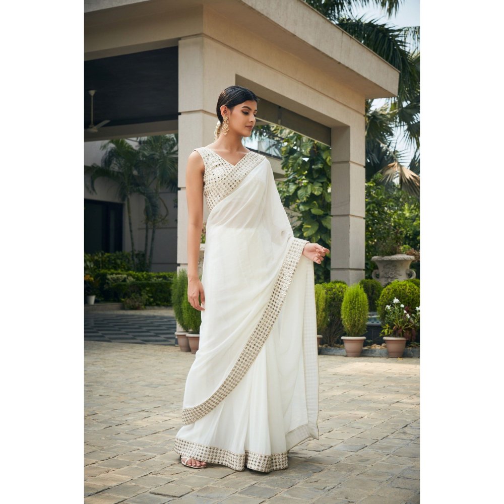 Bohame Ayra Off White Mirror Work & Chikankari Saree with Stitched Blouse & Petticoat