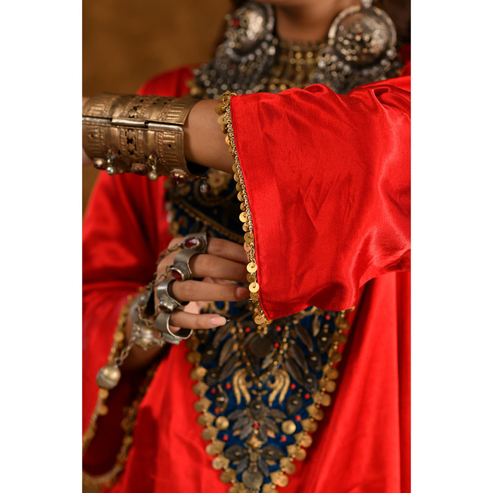 Description : This Elegant Suit Set From The Raahi Collection Is Crafted From Lustrous Mashru Silk, Handmade and Hand-Dyed In The Heart Of Kutch. The A-Line Kurta, In A Vibrant Red Base Color, Features Bell Sleeves and Practical Pockets, Paired with An Elasticated Salwar for Unmatched Comfort. The Highlight Of This Piece Is The Intricate Afghani Coin Work, Meticulously Crafted On Contrasting Teal Blue Velvet Patch Adding A Striking Touch Of Tradition and Opulence.