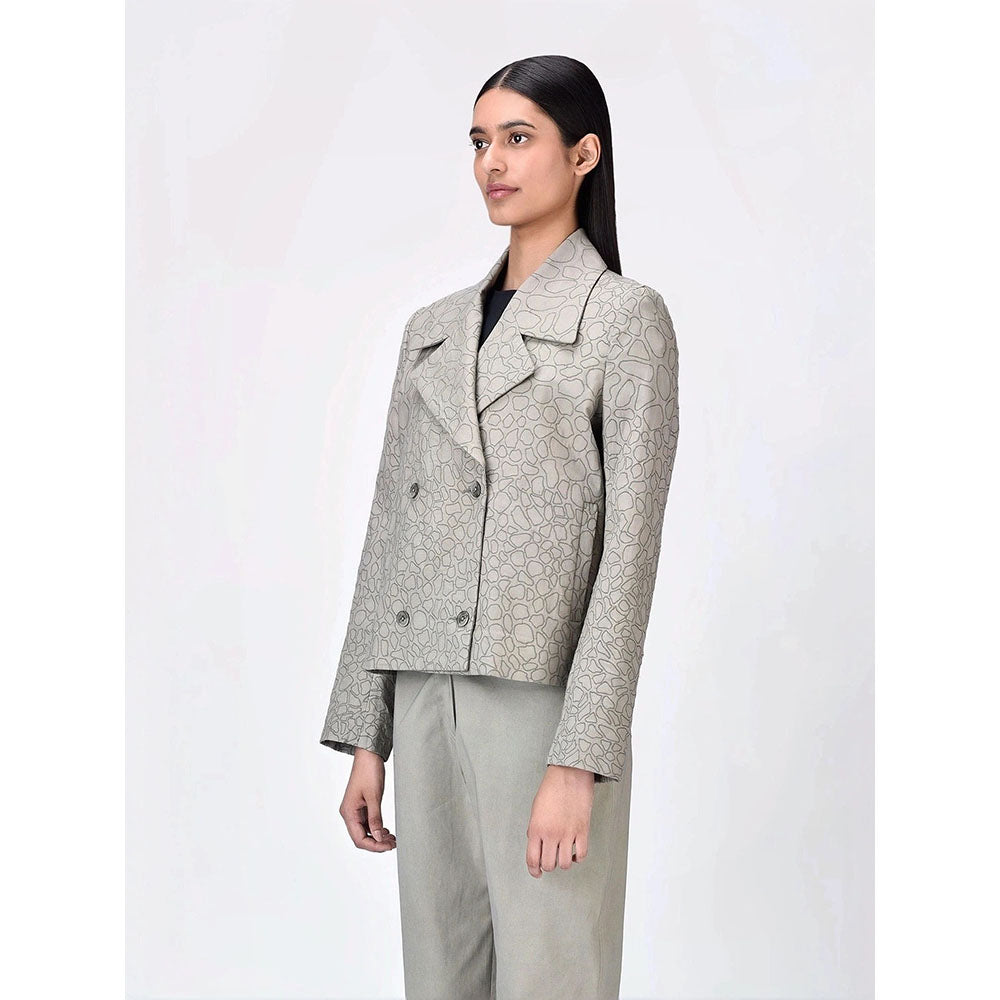 Description : This Grey Cotton Blazer Combines Classic Sophistication with A Playful Edge Through Its Geometric Print, Bringing A Fresh Twist To Traditional Tailoring. The Notched Lapel and Double-Breasted Front Add Structure, Creating A Sharp Silhouette That's Both Chic and Versatile. The Breathable Cotton Fabric Ensures Comfort, Making It Perfect for Both Workdays and Weekend Outings. Style Tip: Pair It with High-Waisted Trousers and Loafers for An Effortlessly Polished Look That Stands Out.