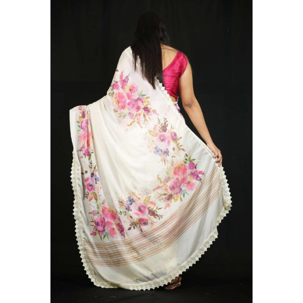 Isadora Life Womens Embroidered Lace Work White Pre-Draped Saree With Unstitched Blouse