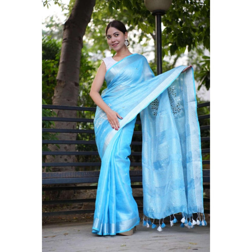Isadora Life Womens Embroidered Mirror Work Blue Pre-Draped Saree With Unstitched Blouse