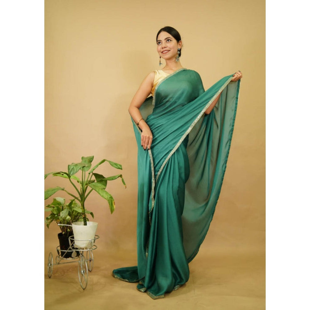 Womens Solid Sequined Green Pre-Draped Saree With Unstitched Blouse