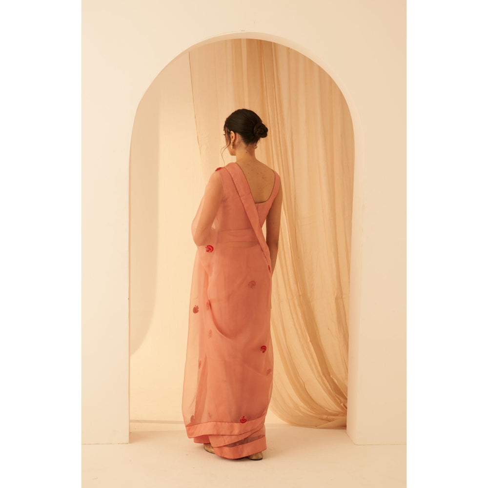 Women Peach Organza Embroidered Saree with Peticoat without Blouse