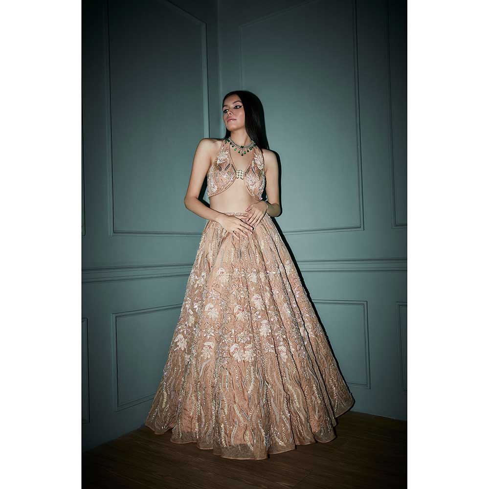 Description : Presenting an elegant beige lehenga, blouse, dupatta set from Bindani by Jigar and Nikita. It is crafted from high-quality. It features embellished & sequined pattern with beads and stones work, blouse styles sleeveless, halter neck and mid waist rise style. It is perfect for wedding or any special occasions.