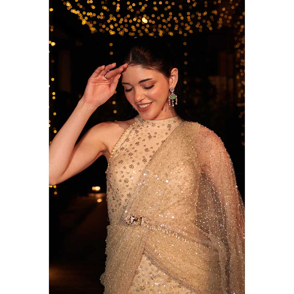 Description : Elevate Your Elegance with This Stunning Pearled Yellow Gown, Designed To Make A Statement Featuring A Sleeveless Silhouette with A Chic High Neck, The Gown Is Adorned with Intricate Embellishments Of Matching Pearls, Sequins, and Delicate Silver Kut dana, Creating A Mesmerizing Shimmer The Attached Pre-Stitched Drape Flows Effortlessly, Adding Movement and Grace To The Ensemble, While The Border Of The Drape Is Beautifully Detailed with Pearl Tassels, Offering A Touch Of Refined Glamour Perfect For A Grand Occasion Or A Sophisticated Evening Affair, This Gown Combines Timeless Beauty with Contemporary Craftsmanship