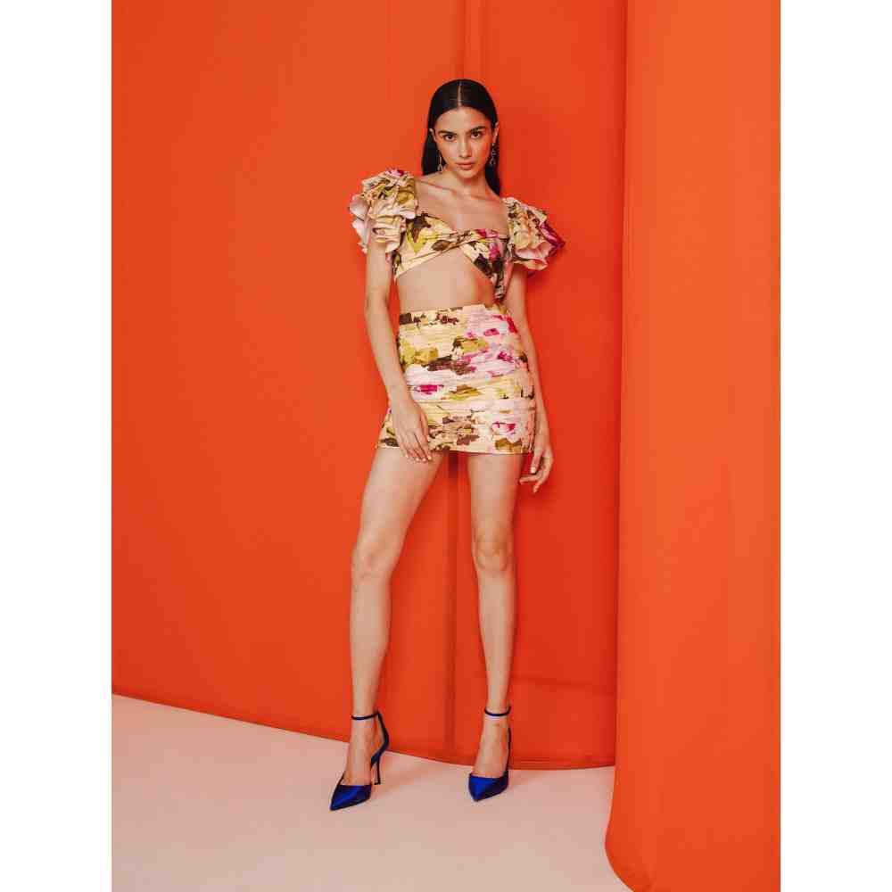 Description : Rue Matching Set 100% CottonMade In IndiaDry Clean OnlyTwisted Bandeau With Flirty Frilly Sleeves Back Detailed With Bow Tie Ruched Mini Skirt With Hidden Side Zipper Closure