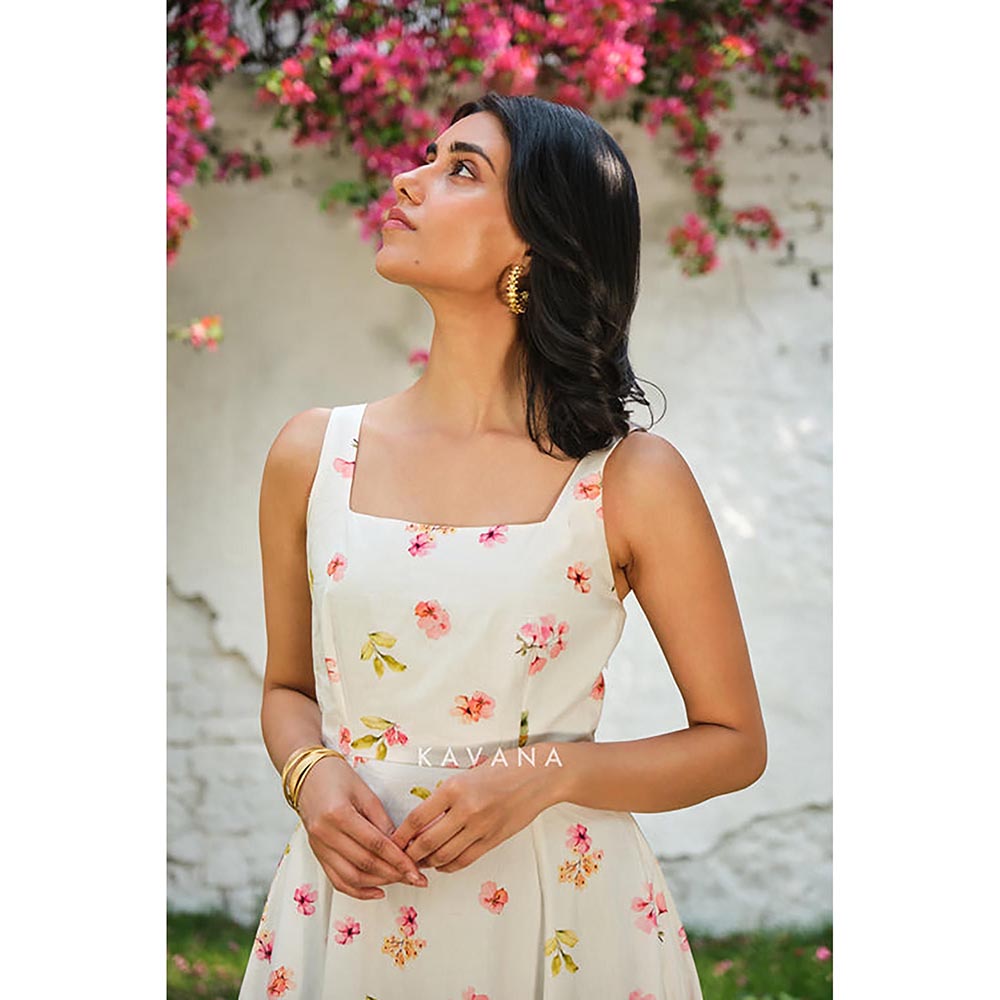 KAVANA Women Floral Print Cream Ukiyo A-Line Midi Dress