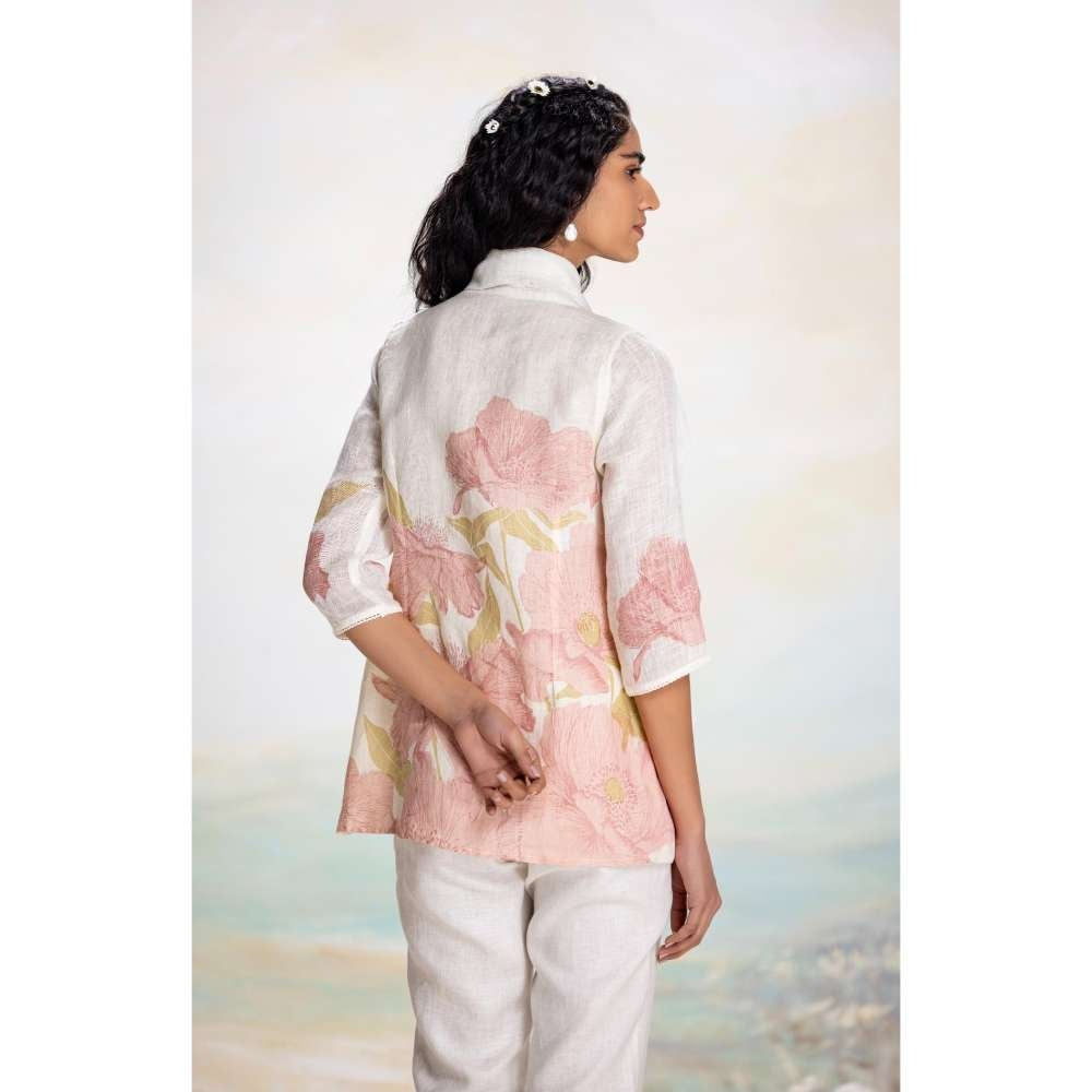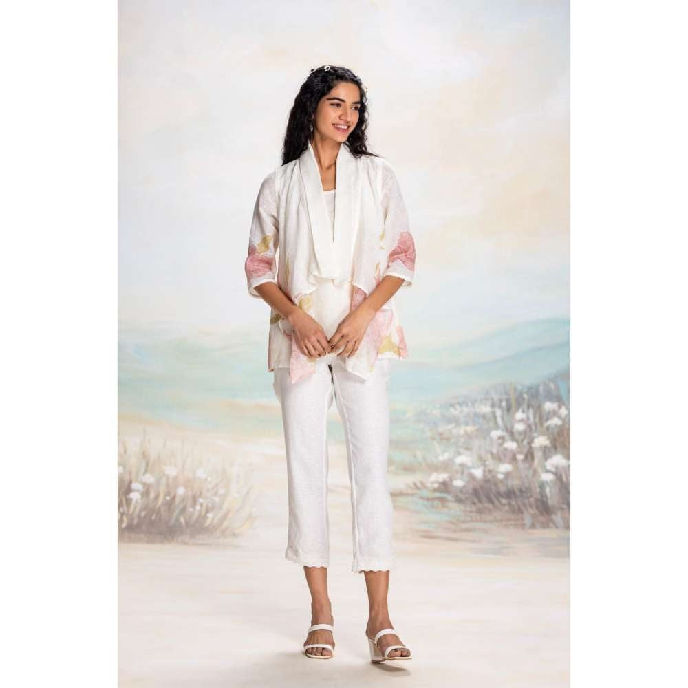 Description : 100%Linen Jacket Dress Length 28", Pant Length 36" / Model Height 5'9'' A Stylish Jacket Top Featuring A Cascading Shawl Collar And 3/4 Sleeves. Hand Screen Printed With Blobs Of Paint Forming A Artist Elegance Of Abstract Floral That Flows All Along The Hem And Sleeves, In The Hues Of Blue And Pink. Relaxed Fit Machine Wash Cold