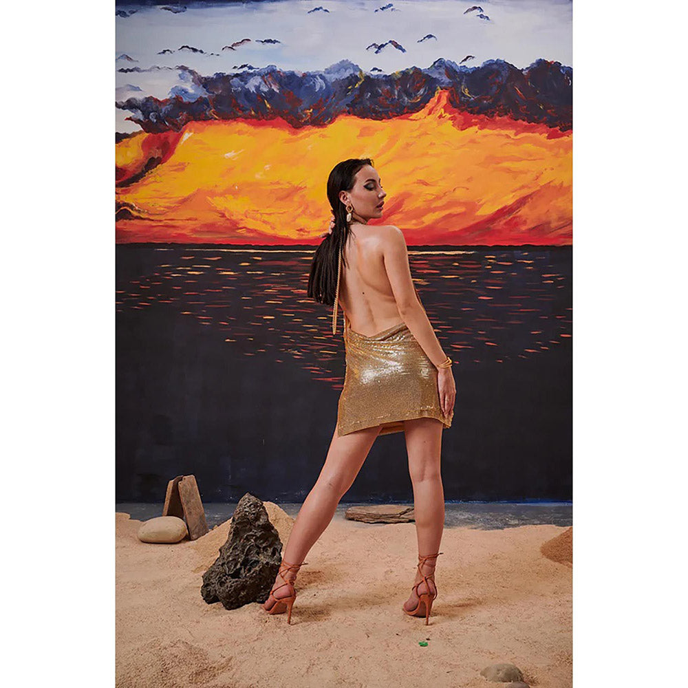 Description : 24 Karat Gold Mini Dress Has Halter Neck Regular Fit Which Is Good For The Party