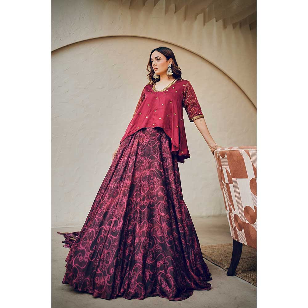 KOSWI Pink Cherry Print Embroidered Lehenga with Top and Dupatta (Set of 3)