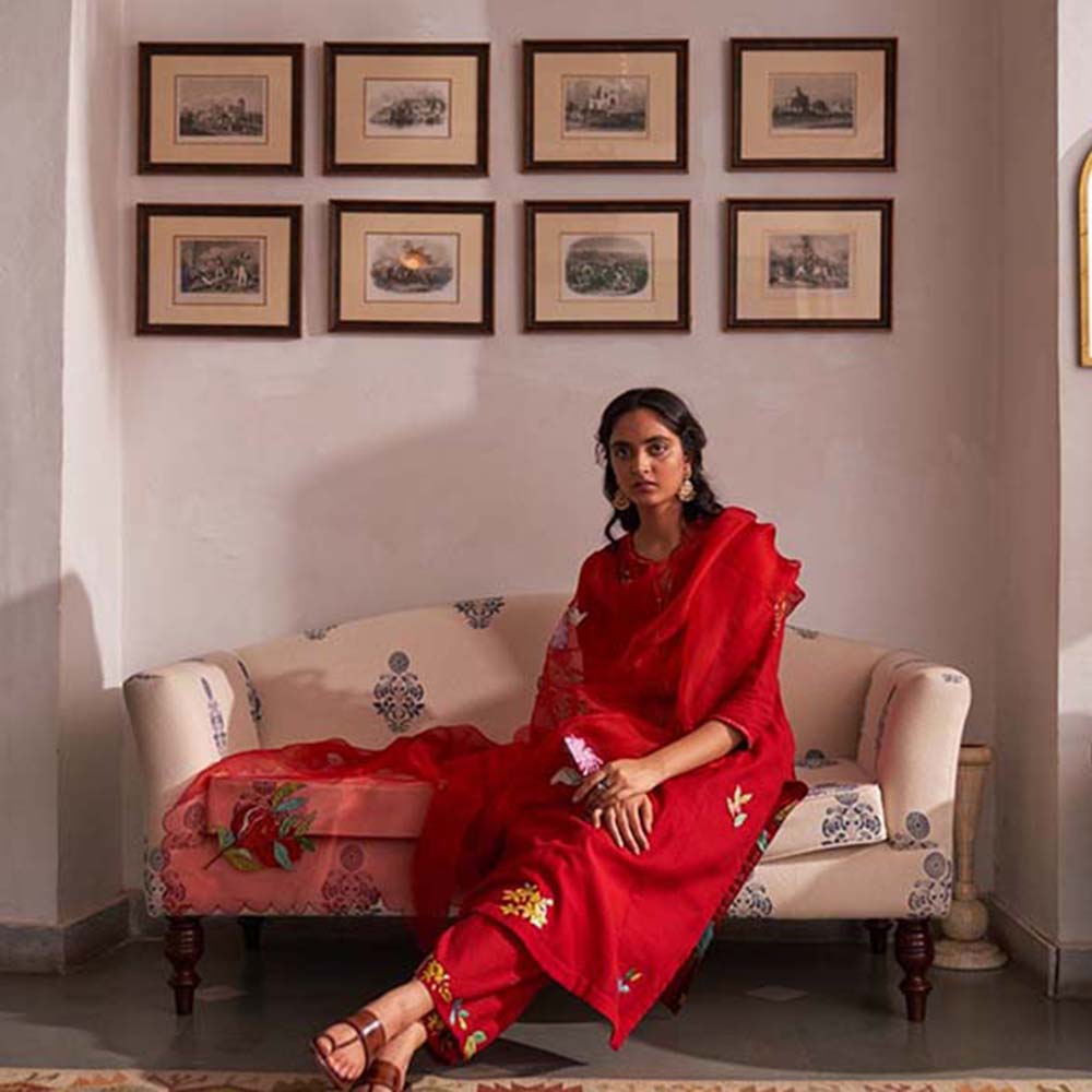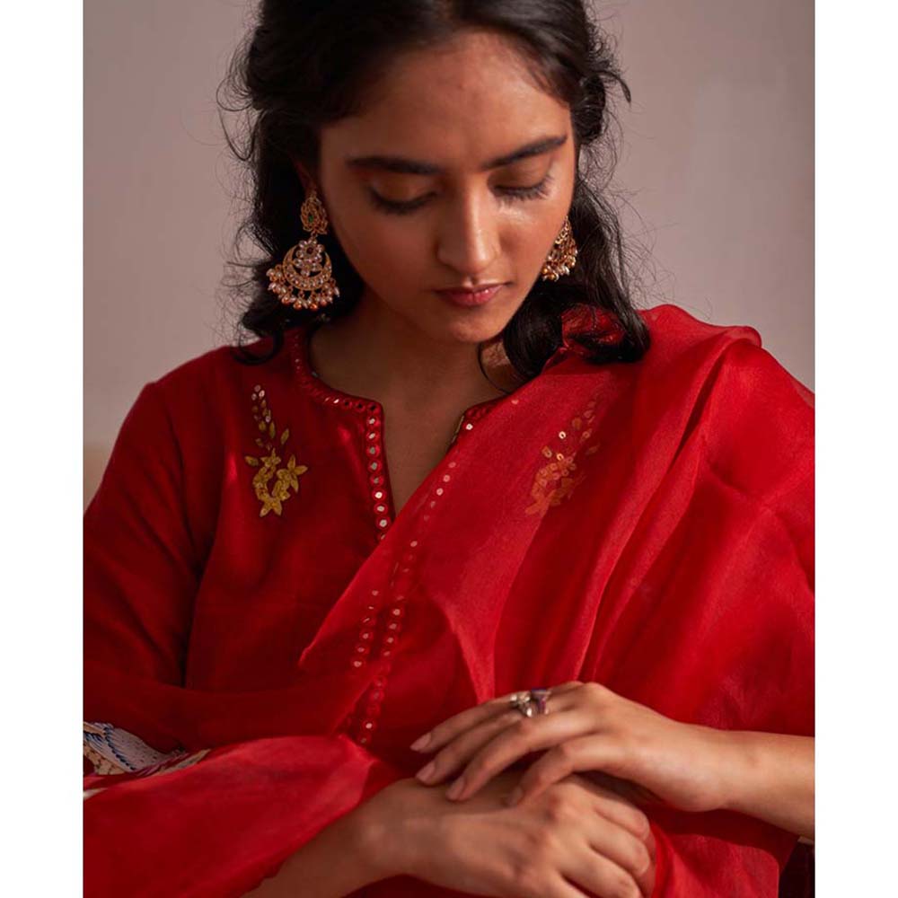 Description : To look beautiful this wedding season, grab this lovely red kurta, pant, dupatta set. It is crafted from premium quality. It features embellished/sequined pattern with three fourth sleeves, round neck and straight mid waist bottom style. Pair it with matching jewellery and heels for the gorgeous look.
