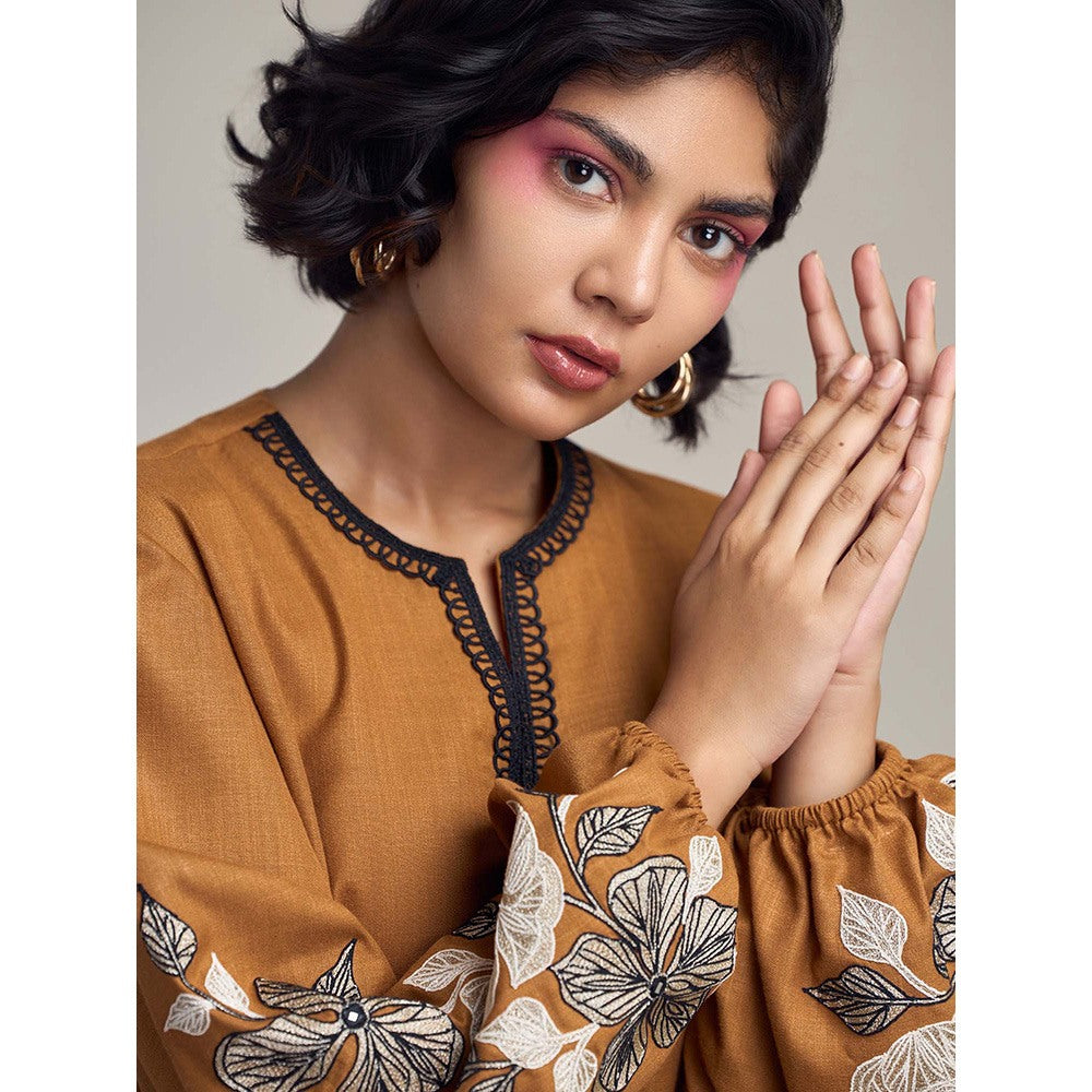 Description : An Ode To Earthy Elegance, The Sand Dunes Co-Ord Set Features A Full-Sleeve Top Adorned With Intricate Ivory And Black Hand Embroidery And Delicate Hand Made Lace Detailing. Paired With A Staple Brown Relaxed-Fit Pant, This Set Is Handcrafted For Comfort And Grace. The Natural Textures And Subtle Contrasts Evoke A Laid-Back Yet Sophisticated Vibe, The Kind Of Effortless Beauty That Defines Mai solos.