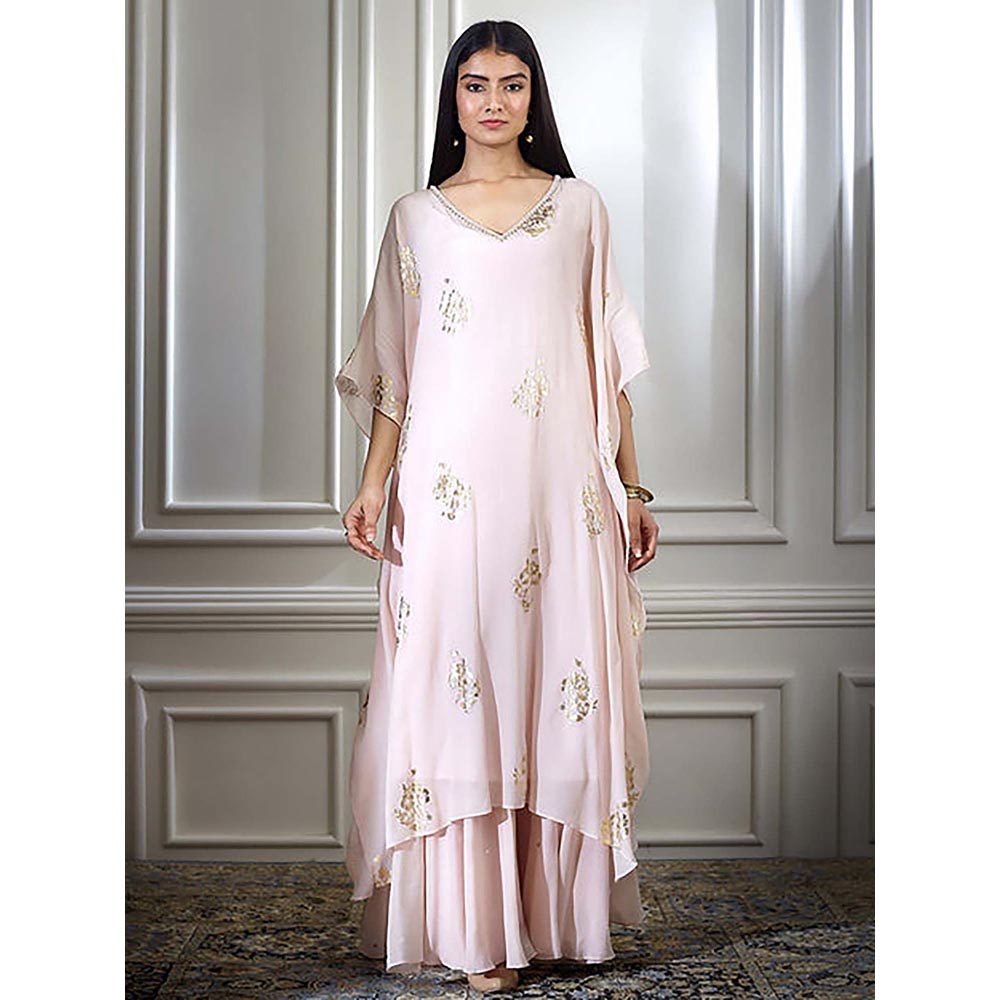 description : Reinvigorate your wardrobe with this peach sharara set from MANDIRA WIRK. Crafted from chanderi, this beautiful set is finished with full sleeves and a V-neck. Pair it with exquisite jewellery to finish off the look.