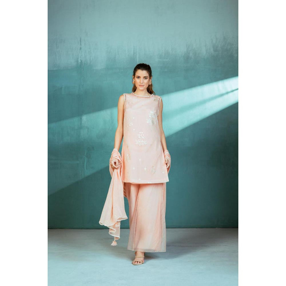 description : Reinvigorate your wardrobe with this pink palazzo set from MANDIRA WIRK. Crafted from chanderi, this beautiful set is finished with a sleeveless design and round neck. Pair it with exquisite jewellery to finish off the look.