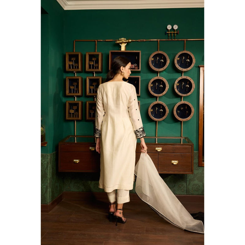Beige Embroidered Chanderi Silk Kurta with Pant and Organza Dupatta (Set of 3)