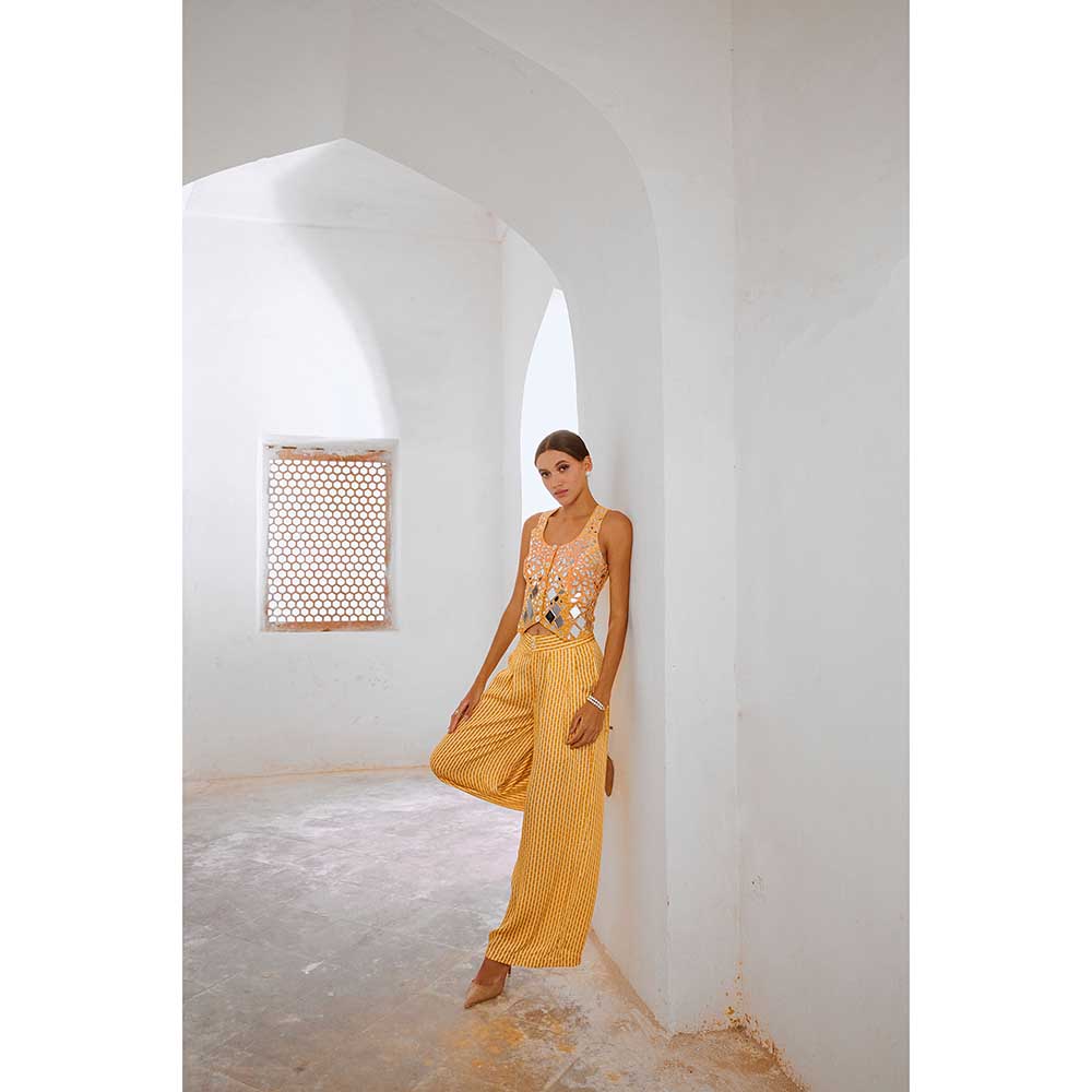 PALLAVI JAIPUR Gulbahar Daisy Yellow Sheesha Koti & Loose Palazzo (Set of 2)