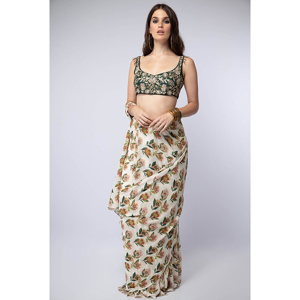 Payal Singhal Emerald Green Printed Saree with Petticoat and Stitched Blouse