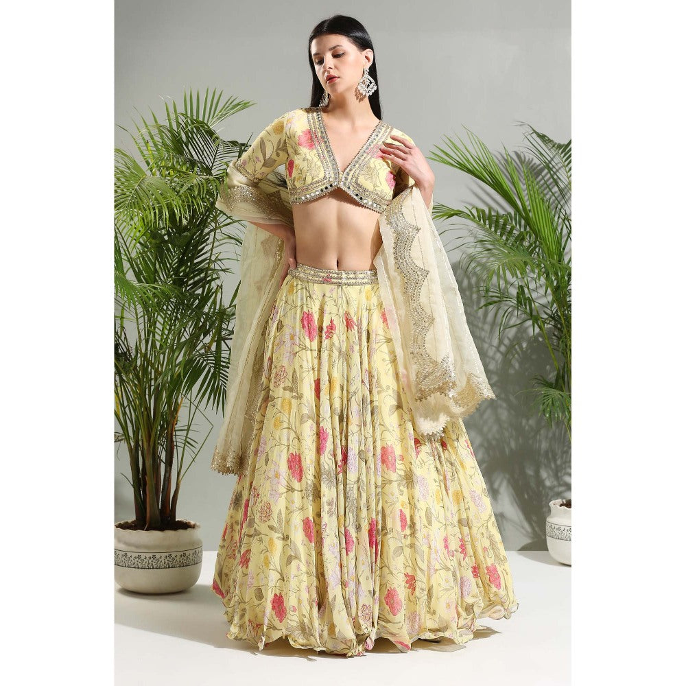 PRITI SAHNI DESIGNS Yellow Floral Lehenga with Blouse and Dupatta (Set of 3)