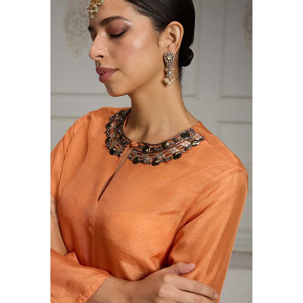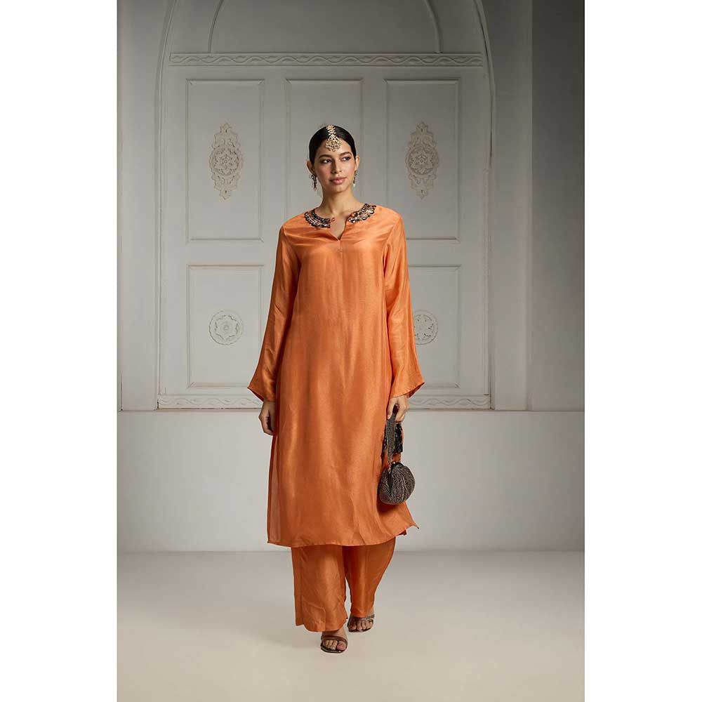 Description : This Kurta Set, Featuring Straight Solid Pants And A Tunic With An Intricately Embellished Neckline, Showcases A Vibrant Solid Hue. The Ensemble Combines A Rich Orange Colour With Intricate Details To Create A Striking Look. You Can Elevate It Further With A Statement Clutch.