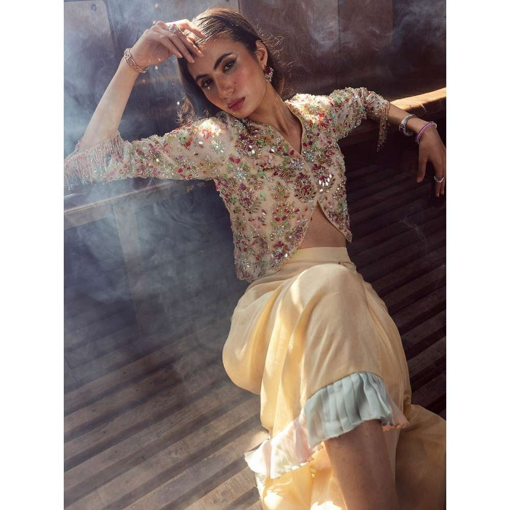 Description : Intricate multicolored pearls and zardozi mirror thread work. Tailored to sartorial perfection from premium quality fabric, it assures a soft and soothing touch against the skin. The exquisite silhouette adds to its appeal.