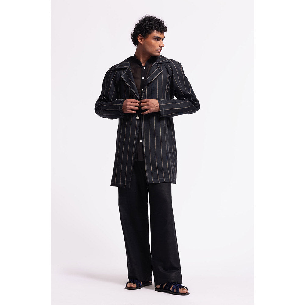 Description : Exude sophistication in this navy blue jacket from Rohit Bal. Crafted from linen for a luxe feel, this jacket is finished with full sleeves and a notched lapel. Team it with a pair of trousers and juttis or monk straps.