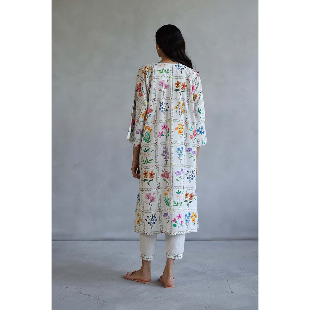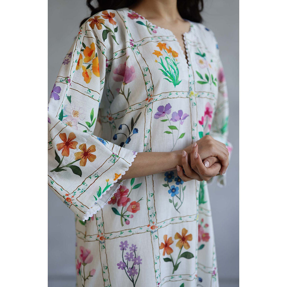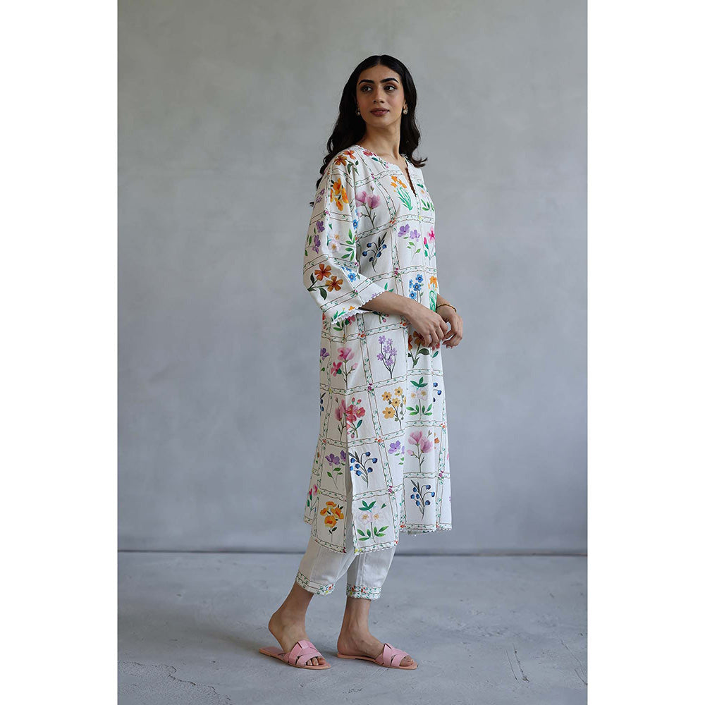 Description : Adorn the ethnic elegance with this white Kurta set from Roza. Made from high-quality linen, it features pull on closure and floral pattern along with three fourth sleeves & round neck design. Pair it with some jewellery and flats to complete your ensemble.