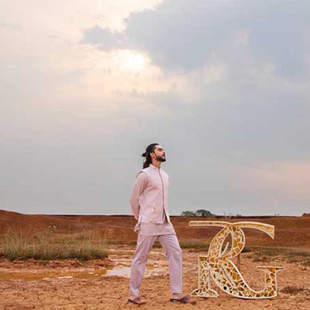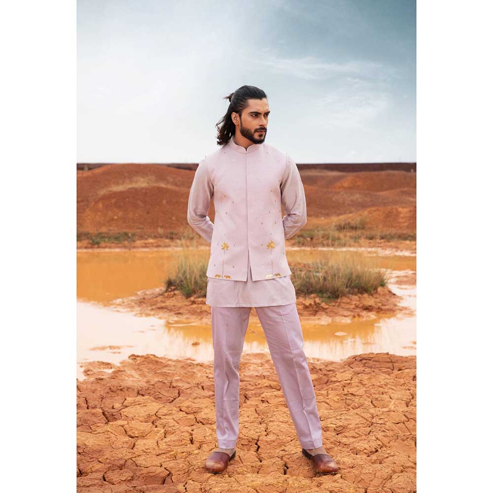 Description : Leave the crowd spellbound by stepping out in this captivating periwinkle tiger bundi jacket with kurta and pant from Runit Gupta. Made from high-quality cotton, this piece features full sleeves and a mandarin neck. Style it with a watch and shoes to complete the ensemble.