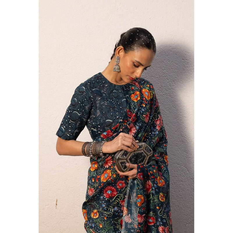 Saksham & Neharicka Blue Printed Saree with Stitched Blouse