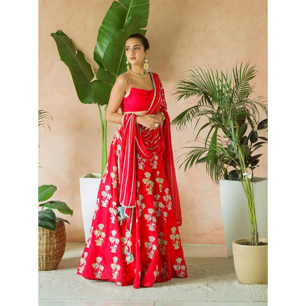 The Red Jaipuri Lehenga with Blouse and Dupatta] (Set of 3)
